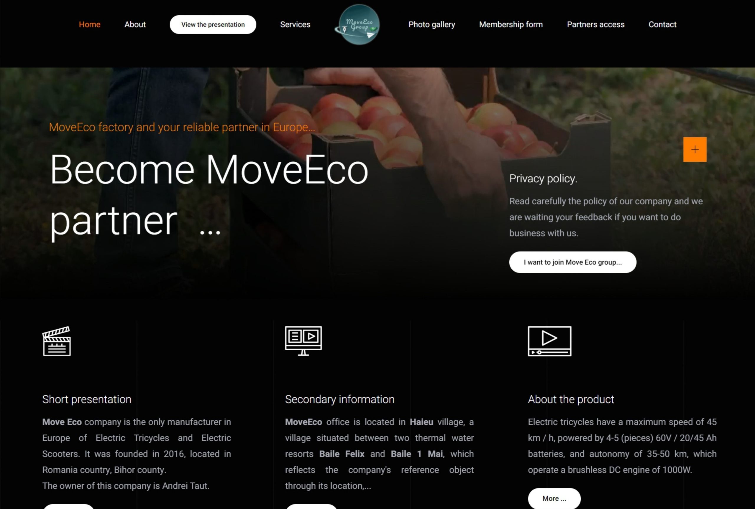 Consolidarea rețelei de business cu colaboratori și revânzători în toată Europa a făcut ca acest grup să ajungă pe piața internațională. Datorită respectului față de clienți, ofertei largi de produse, faptului că asigurăm piesele de schimb și service la sediu/domiciliu, ne menținem pe o poziție de producător demnă de luat în considerare în alegerea produsului final. Înscrierea partenerilor și comenzile internaționale prin platforma europeană MoveEco.